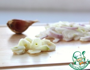 • Нарежьте тонкими полукольцами 2 луковицы и тонкими пластинками 4-5 зубков чеснока