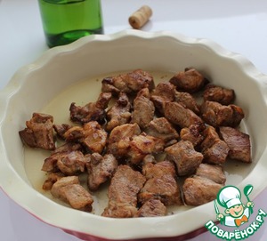 • Положите мясо в жаропрочную форму, влейте 150 мл белого сухого вина или воды