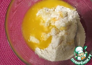 В миску выкладываем наше пюре, добавляем желток, растопленное и охлажденное до комнатной температуры масло, просеиваем муку, замешиваем мягкое, податливое тесто. В зависимости от густоты пюре муки может понадобиться чуть больше. Масло можно не растапливать, если заранее вынуть его из холодильника и нагреть до мягкости естественным образом.