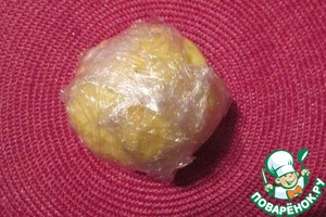 Формируем из теста шар, заворачиваем его в пленку и убираем в холодильник минут на 40, можно на час и более.