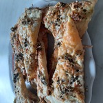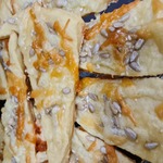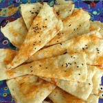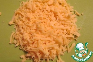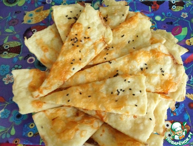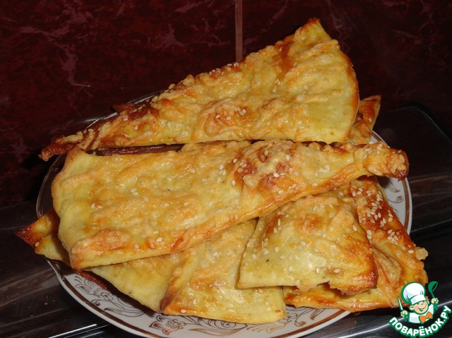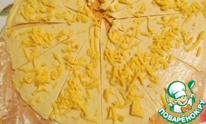 Смазываем круг половиной взбитого белка, чуть подсаливаем и рассыпаем половину тертого сыра. (Дополнительно к сыру можно по вкусу присыпать лепешку тмином или кунжутом)