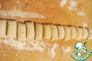 Достаем тесто. Подсыпаем на разделочную доску муку, катаем из теста колбаску и делим её на 16 приблизительно равных кусочков.
