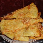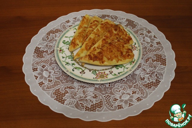 Каждый кусочек теста раскатываем в тоненькую лепешку диаметром примерно 17-18 см, тесто раскатывается очень легко, не рвется.