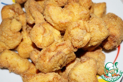 Разогреваем растительное масло в сковороде. Масло должно быть много, чтоб кусочки полностью погрузились в него. Окунаем кусочки филе в кукурузную панировку и жарим на сковороде до золотистой корочки.