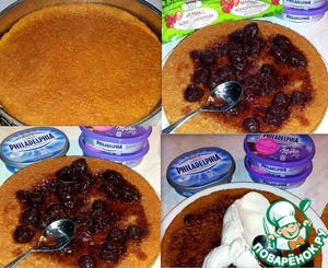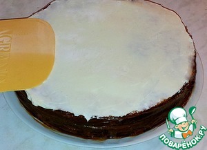 На вторую положить третью часть. Пропитать сиропом и обмазать "Филадельфией". Бока торта обмазать шоколадной "Филадельфией".