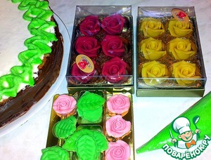 Для украшения возьмём белковую глазурь, сахарные розы и листочки.