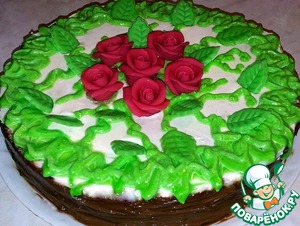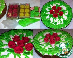 Края торта украсим зелёной глазурью. В центр положим розы.