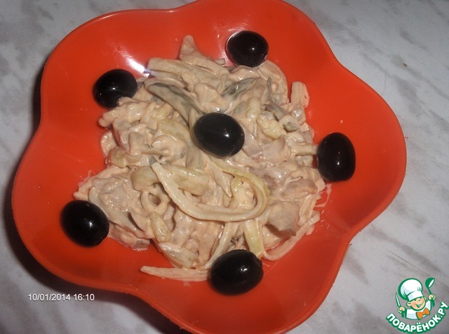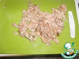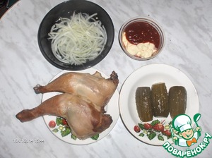 - Курица (копченая, либо одна грудка, либо 2 окорочка) — 2 шт