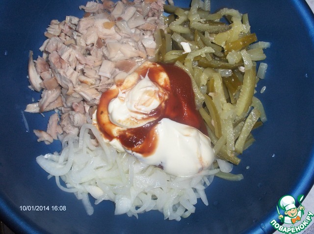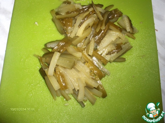 - Огурец (маринованные, либо соленые, если небольшие, с указательный палец, то шт 5-6.) — 3 шт