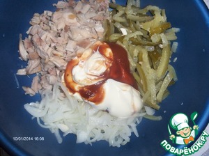 - Лук репчатый (небольшая, либо половина большой. Замариновать в уксусе на 1-2 часа) — 1 шт