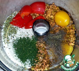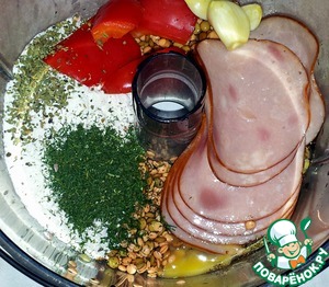 Вечером её промыла и переложила в комбайн для измельчения. Всыпала муку (100 г), укроп, базилик, перец, соль, разрыхлитель. Разбила яйца и положила болгарский перец.