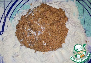 На стол насыпала муку ( 150 г ) и выложила измельчённую массу. Верх полила маслом и вымесила тесто.