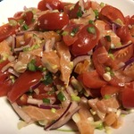 Подготовим ингредиенты: лосось, помидоры и зеленый лук порезать мелкими кубиками. Затем перемешать, добавив перец.