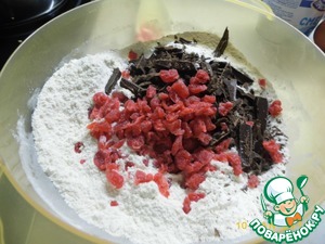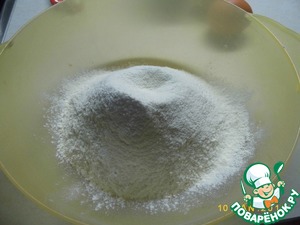 • Просеиваем муку. Добавляем в неё разрыхлитель, соду, соль и сахар. Перемешиваем.