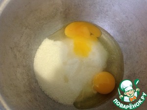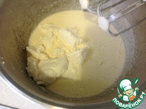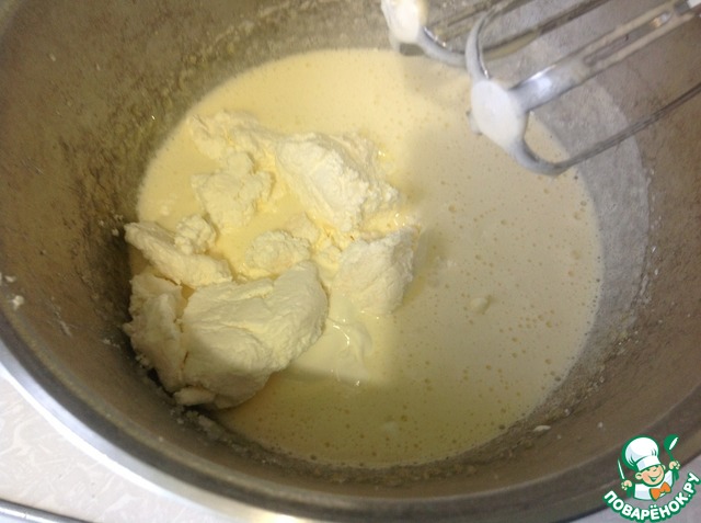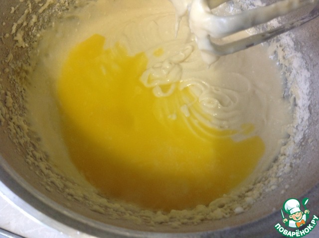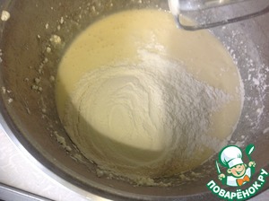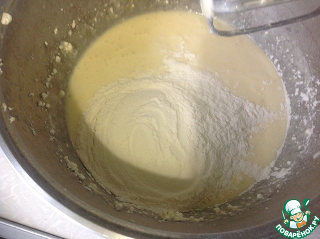 Далее выкладываем разрыхлитель и муку, взбиваем
