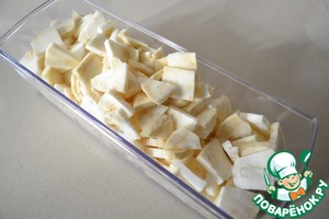Тем временем очищаем сельдерей и режем его небольшими ломтиками. Нам нужно 800 г очищенного сельдерея, т. е., сам корень должен весить примерно 1 кг.