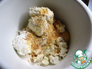 Приготовить начинку. Творог смешать с пудингом, сахаром и яйцом. Добавить корицу и апельсиновую цедру.