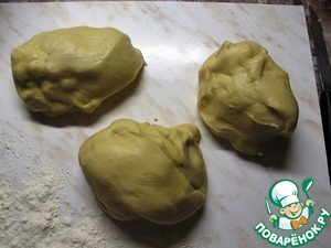 Когда тесто поднимется, выложить его на доску и разделить на три части.
