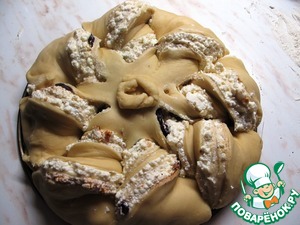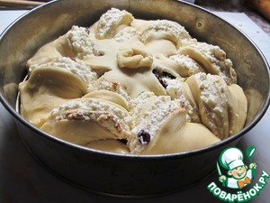 Снова начинку, посыпать вишней. Накрыть последним пластом теста. Острым ножом сделать надрезы к центру не до конца.