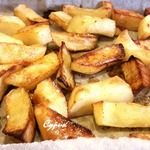 На противень положить пергамент и выложить картофель и поставить в предварительно разогретую до 230 - 250º до полного приготовления ( у меня на это уходит минут 40). После того, как картофель фри будет готов, переложить его на блюдо и посолить.