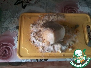 На разделочной доске режем мелко чеснок, сверху насыпаем крупную соль, потом специи (перец чёрный, красный, шафран, гвоздику и другие (на ваш вкус)). Обваливаем горячее сало в специях и соли.