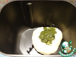 Тесто делю на две равные части. Одну часть оставляю в ведерке хлебопечки, добавляю чай матча, размешанный с водой. Включаю хлебопечку снова на режим замеса теста до равномерного распределения чая в тесте.