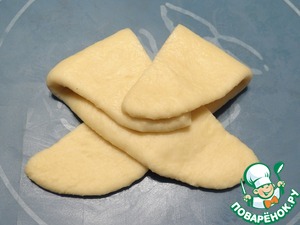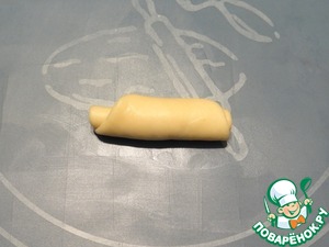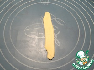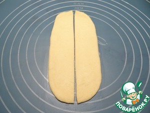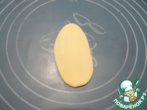 Больший шар теста раскатываю в овал длиной около 16 см и шириной около 7 см. Ножом разрезаю овал на две части, как на фото.