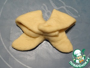 Бантик переворачиваю, по центру прикладываю маленькую полоску из теста, снова переворачиваю и защипываю края полоски, расположенной по центру бантика. Опять переворачиваю бантик.