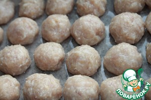Из фарша скатать небольшие шарики, размером с грецкий орех и выложить их на подготовленный противень. Запекать 20 минут при 200* С