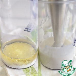 Взбить соус. Можно использовать готовый майонез, но так гораздо вкуснее и полезнее. Для этого вылить масло и молоко в узкую посуду, стакан или банку. Добавить соль, сахар, горчицу и уксус. Все в одну посуду. Взбить погружным блендером, пока масса не загустеет. Заостряю внимание! Именно ПОГРУЖНЫМ блендером.