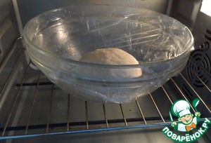 Тесто положить в миску, смазанную маслом. Накрыть её полиэтиленовой пленкой, поставить в немного теплую духовку с включенной конвекцией или оставить в любом теплом месте.