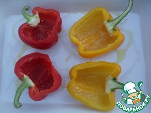 Разогреть духовку до 200*С. Стручки перца разрезать вдоль и удалить сердцевину. Форму для запекания сбрызнуть оливковым маслом и уложить в неё половинки перца.