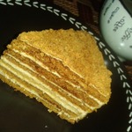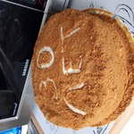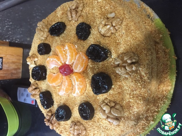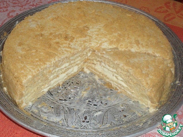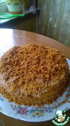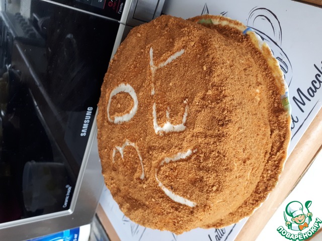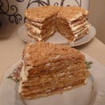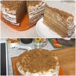 Тесто было немного туговатым при раскатке. Может, или слишком много муки положила, или из за того, что не было возможности сразу спечь коржи оно немного подсохло на столе. Но тем не менее, торт получился вкусным и всем понравился!