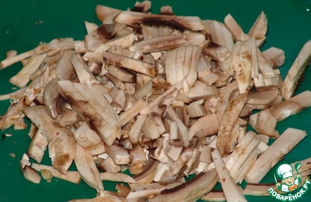 Нарезать курицу ломтиками, обжарить до золотистого цвета