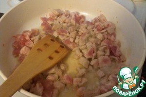 Нарезаем корейку, изначально отбив кусочки мяса на мелкие кубики, обжариваем до образования корочки, дав бульону выпариться (примерно 20-30 минут, можно немного убавить огонь, чтобы не подгорело)