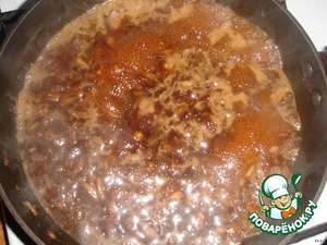 Пока мясо жарится, маринад нужно довести до кипения и варить на слабом огне около 10 минут. Получается густой соус. Чтобы он имел однородную консистенцию, готовый проваренный соус я протерла через ситечко.