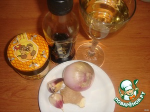 Смешайте соевый соус, вино, измельченный чеснок, мелко рубленный лук, тертый на мелкой терке корень имбиря, мед. Полученный соус вылейте в широкую емкость, в которую положите подготовленные стейки.