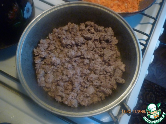 На разогретой сковороде с подсолнечным маслом обжарить фарш. Жарим до румяности, помешивая и разминая вилкой.