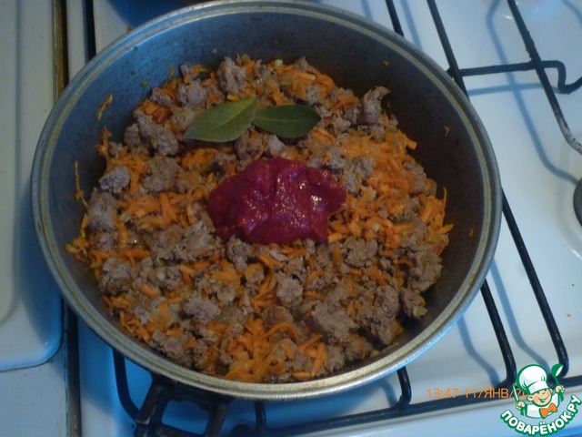 Все соединяем и добавляем томатную пасту, лаврушку и чеснок (по желанию).