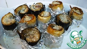 Так заворачиваем все филе. Лучше, чтобы филе в стаканчиках было спинками вверх, тогда больше похоже на баклажан, но мама накрутила, как получится.