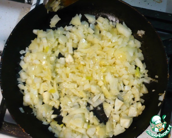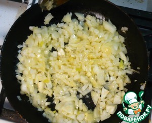 Лук режем кубиками и обжариваем на половине сливочного масла.