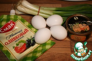 Нам понадобятся продукты: лук зелёный, тунец, майонез и яйца