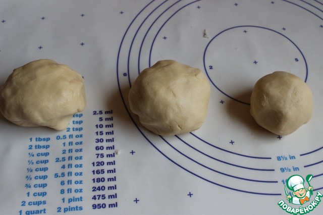 Добавим яйцо и постепенно муку. Замесим тесто. Оно будет похоже на пластилин. Разделим его на 3 колобочка. Один я сделала немного меньше.