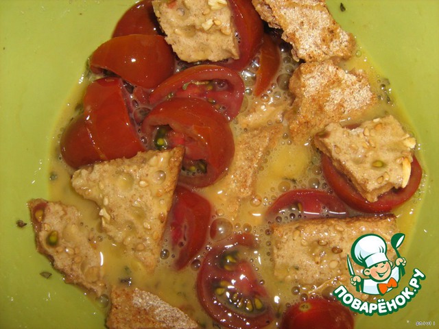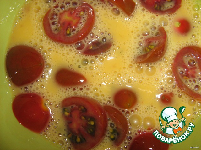Добавляем его в яично-помидорную смесь. Солим, посыпаем орегано. Выливаем на сковородку с разогретым оливковым маслом.