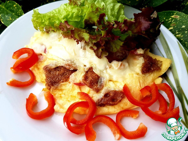 Сверху выкладываем ломтики моцареллы. Когда снизу яичница поджарится, переворачиваем ее лопаточкой моцареллой вниз. Она поджаривается и получается хрустящая корочка.