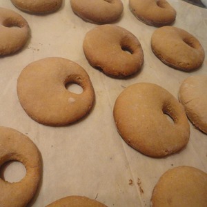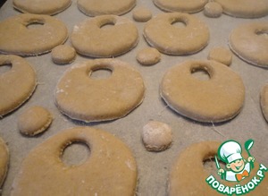 После того, как тесто дойдет, раскатываем его толщиной около 1 см. Вырезаем стаканом пряники, а в них - дырочки для веревочек. Выкладываем на противень. "Кнопочки" от дырочек я тоже выложила на противень между пряниками, чтобы моим домашним было чем перекусить, пока я готовлю основные пряники. Ведь аромат от выпечки стоит просто сногсшибательный.