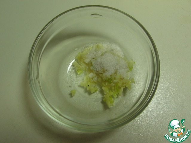 Порубим мелко чеснок и перетрем его с солью. Лучше бы использовать для этого ступку, но я боюсь, что моя фарфоровая так пропитается запахом, что отмыть ее уже не получится, поэтому растираю ложкой в мисочке.