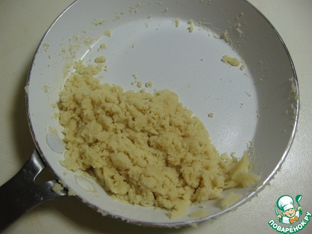 Подготовим муку. Растопим на сковороде сливочное масло и добавим к нему муку, помешивая. Немного обжарим.