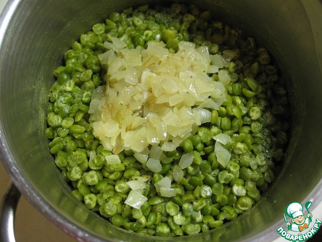 Кода горох сварился, и вода из него выпарилась, добавляем к нему обжаренный лук и пюрируем погружным блендером. Без фанатизма, пусть в супе встречаются непробитые горошинки или кусочки лука.