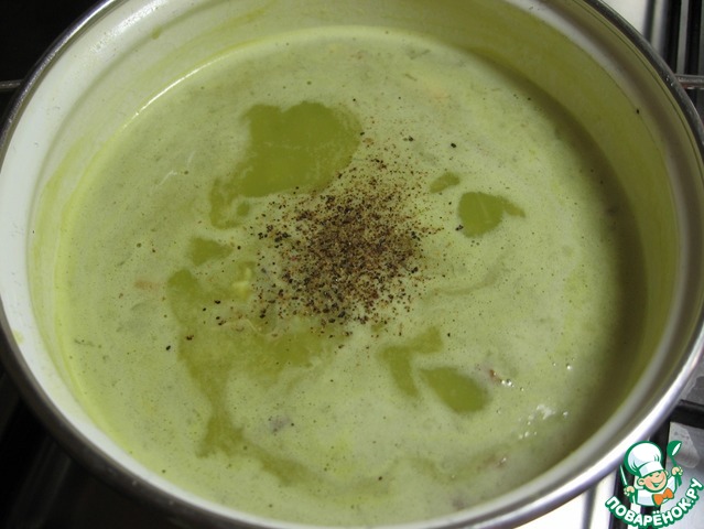 Теперь в уже готовый бульон добавляем горох, муку, чеснок, порезанное копченое мясо. Солим, перчим, оставляем вариться.